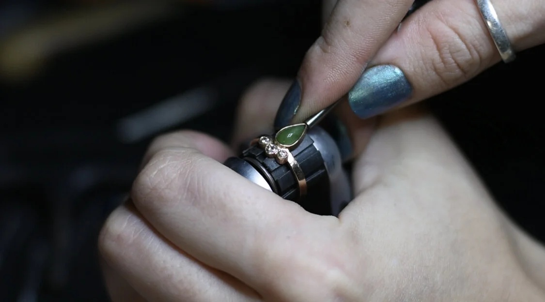 One of the most stunning parts of the creation process is when the stones are finally set. Seats are cut into the metal, allowing a space for the stone to sit. The metal is then pushed over the stone to secure it in place.